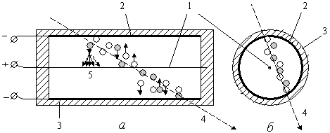 3 - изолятор, 4 - траектория заряженной частицы, 5 - электронная лавина
