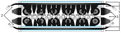 - сцинтилляционные детекторы, 2 - детекторы годоскопа, 3 - черенковские