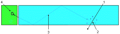 - заряженная частица, 2 - сцинтилляционная вспышка, 3 - световая траектория, 4