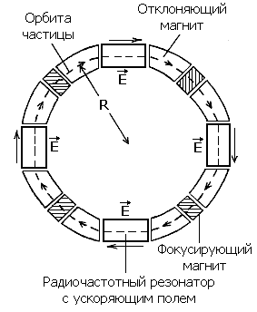 В синхротронах (рис. 1) магнитное поле переменное и частицы двигаются по одной и той же замкнутой траектории, многократно проходя прямолинейные промежутки с ускоряющим электрическим полем радиочастотного диапазона. Частицы, увеличивающие свою энергию, удерживаются на фиксированной орбите с помощью нарастающего поля мощных отклоняющих (в том числе и сверхпроводящих) кольцевых магнитов. Для удержания частиц на орбите постоянного радиуса темп нарастания поля синхронизован с темпом нарастания энергии частиц (отсюда происходит название этого типа ускорителя). По достижении максимального магнитного поля ускоренные частицы либо направляются на неподвижную мишень, либо (в коллайдерах) сталкиваются со встречным пучком, после чего цикл ускорения повторяется. В синхротронах есть два типа чередующихся кольцевых магнитов: отклоняющие двухполюсные (дипольные), удерживающие частицы на орбите, и фокусирующие четырёхполюсные (квадрупольные). Последние фокусируют частицы (как линзы свет), собирая их в узкий пучок, циркулирующий в вакуумной камере.