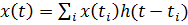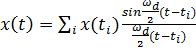 где x(ti) - i-й отсчёт сигнала, ti - момент времени, соответствующий этому отсчёту, ωd=2πʄd - циклическая частота дискретизации, x(t) - интерполированное значение сигнала в момент времени t.