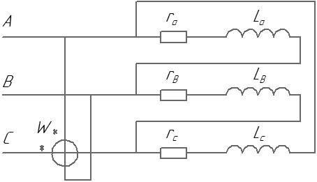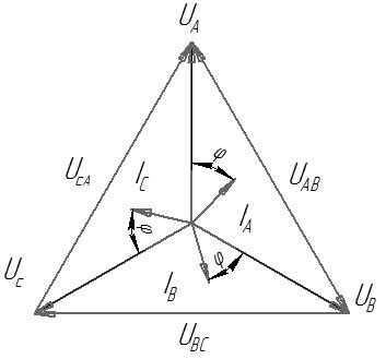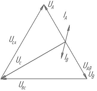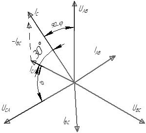 Векторы фазных токов отстают от соответствующих векторов фазных (линейных) напряжений на угол . При включении последовательной обмотки ваттметра к IС и подключении параллельной цепи ваттметра на напряжение UAB ваттметр измеряет мощность трехфазной цепи.