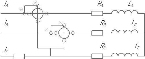 В высоковольтной трехпроводной цепи трехфазного тока необходимо измерить линейные токи, линейное напряжение, коэффициент мощности цепи и расход активной энергии всей цепи.