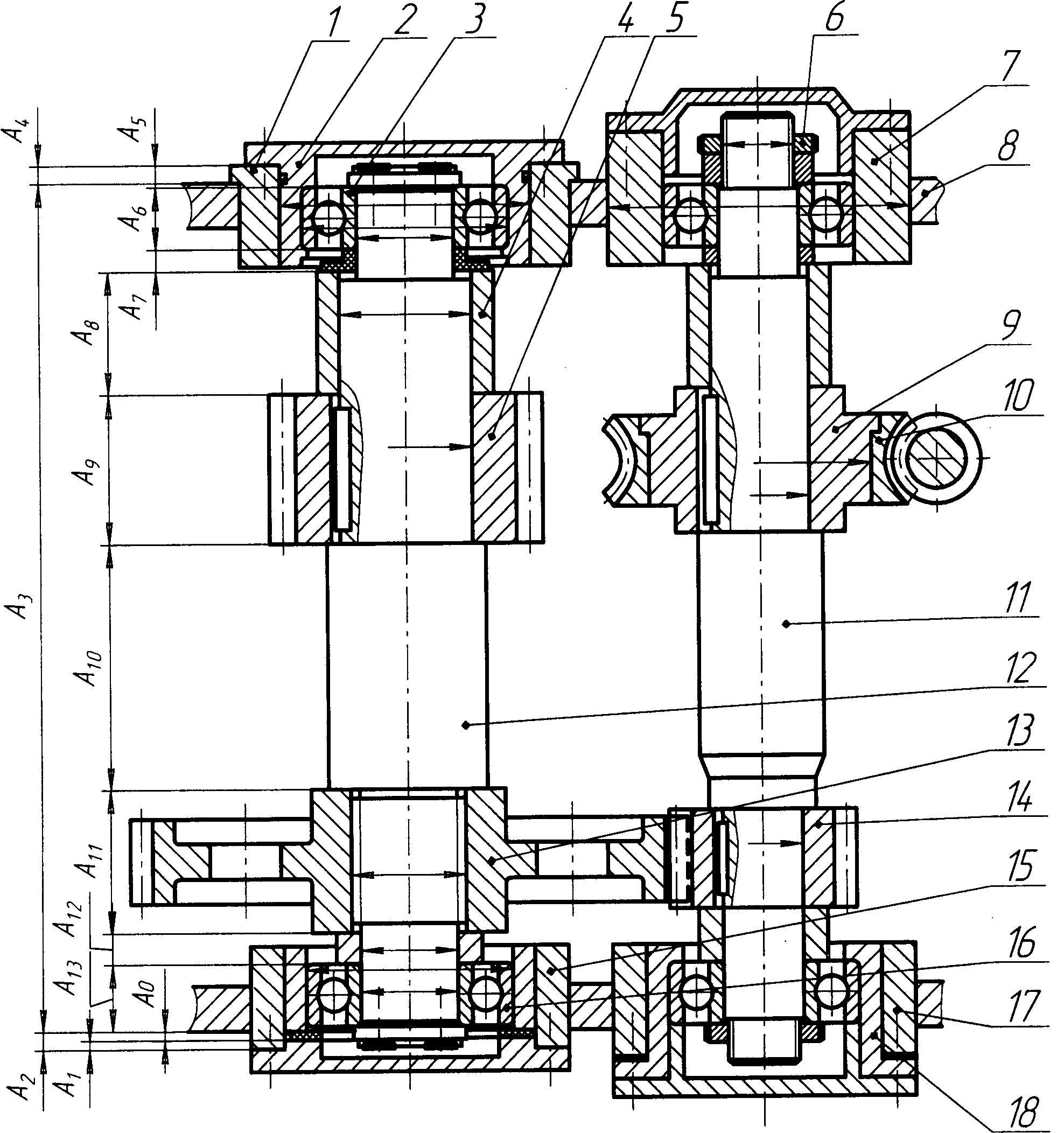 Вращение от червячного колеса 9 через шпонку передается валу 11 и шестеренке 14. Далее вращение от шестеренки 13 передается через шлицы на вал 12