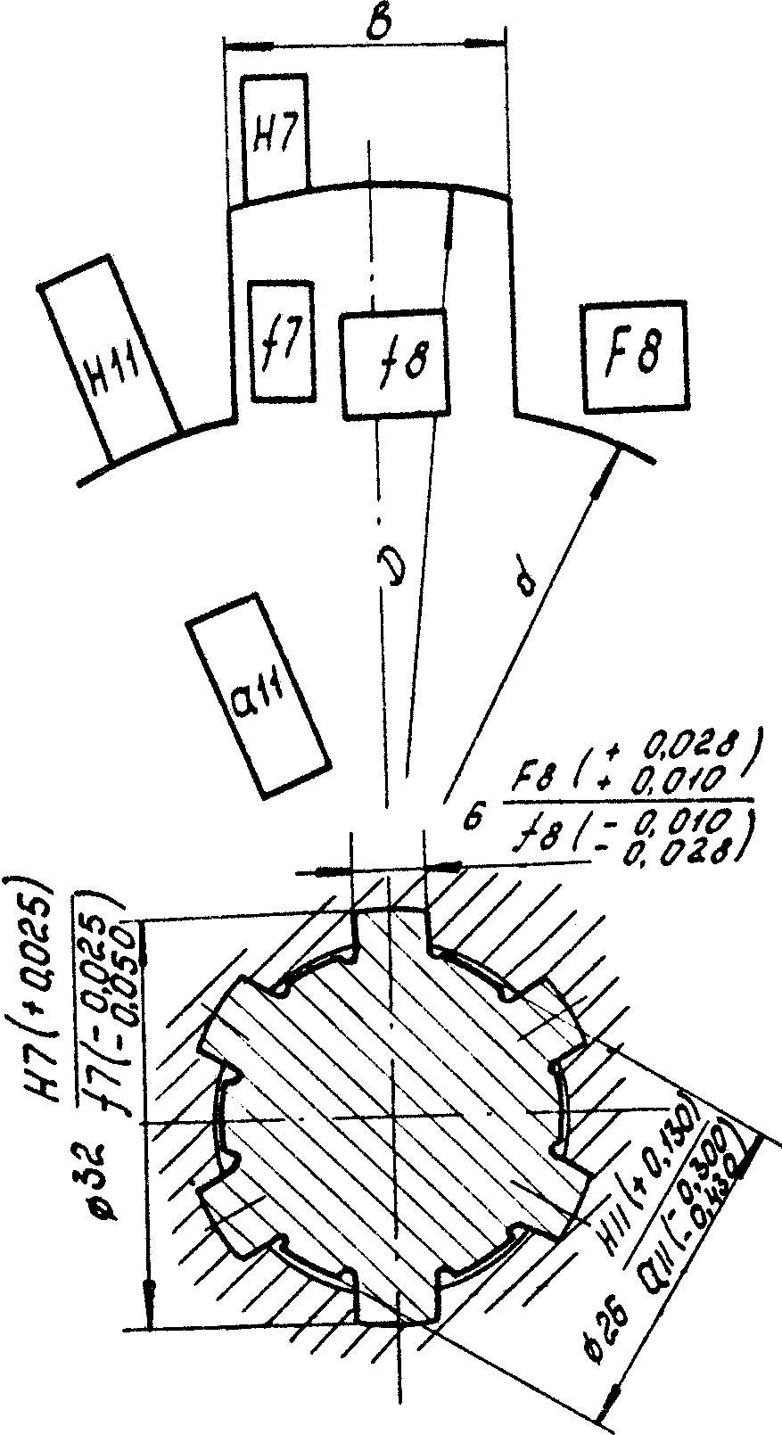Схема полей допусков и чертеж шлицевого сопряжения