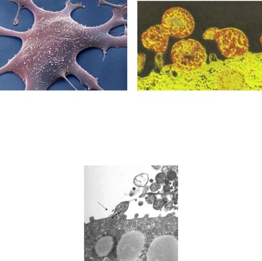 а б Рисунок 8 – Микоплазмы на поверхности фибробласта (а) и паразитизм на