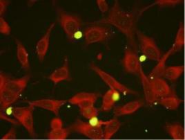 Рисунок 13 – Микоплазмы (ярко-зеленые) на поверхности клеток (красно-бурого цвета) при постановке реакции иммунофлюоресценции.