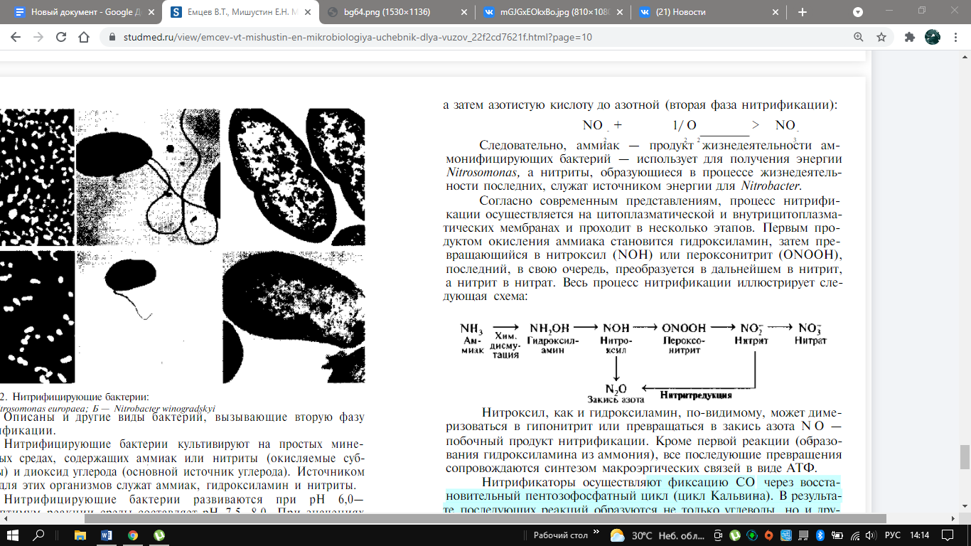 Нитрификация – аммиак, образующийся в почве, навозе и воде при разложении органических веществ, довольно быстро окисляется до азотистой, а затем азотной кислоты. Нитрификаторы оказались хемолитоавтотрофами, т. е. бактериями, использующими энергию окисления аммиака или азотистой кислоты для синтеза органических веществ из СО2 (хемосинтез). Поэтому их клетки очень чувствительны к присутствию в среде органических соединений. Нитрифицирующие бактерии удалось выделить на минеральных питательных средах.