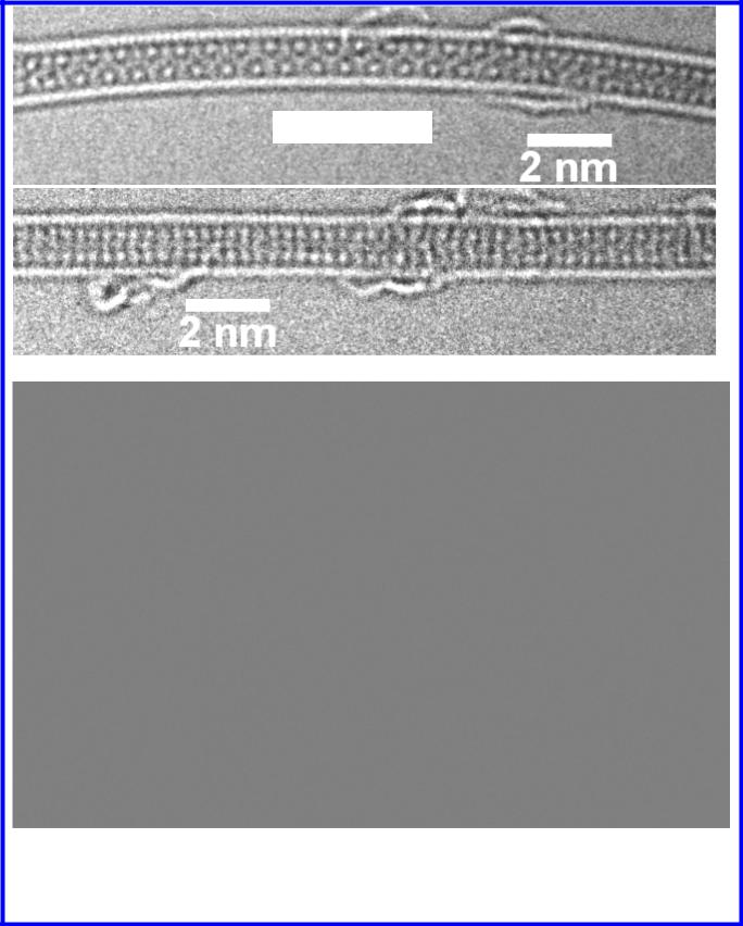 «Прокрустово ложе». Микрофотография одностенной углеродной нанотрубки, заполненной «нанокристаллом» CuI, и гипотетическая модель структуры одномерного нанокристалла CuI при Φ=0º (просвечивающая электронная микроскопия высокого разрешения). Синтез нанотрубок выполнен А.В. Крестининым (ИПХФ РАН); синтез нанокомпозита осуществлен М.В. Чернышевой, А.А. Елисеевым и А.В. Лукашиным (ФНМ МГУ), изображение получено Н.А. Киселевым (ИК РАН) и J.L. Hutchison (University of Oxford) на приборе JEM 3000EX в Оксфорде; модель разработана Р.М. Закалюкиным (ИК РАН)..