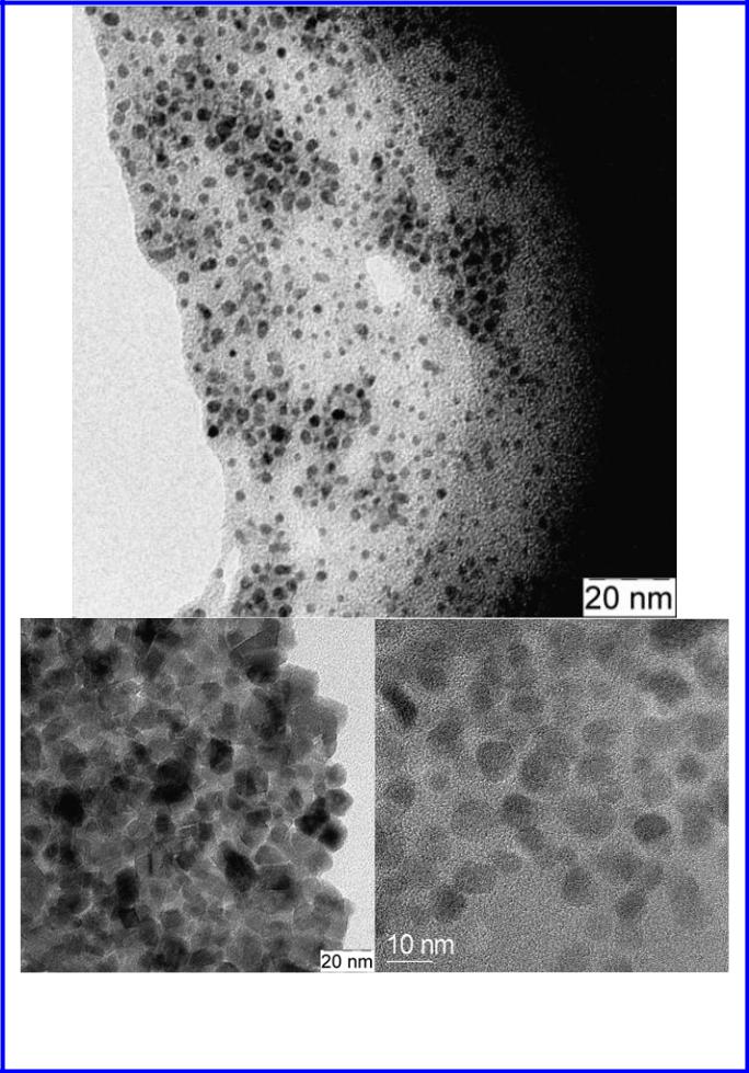Сферические магнитные наночастицы оксида железа (III) в оболочке из олеиновой кислоты (справа), нанокристаллические частицы, полученные с использованием микроэмульсий (слева) и в результате стабилизации наночастиц гуминовыми веществами (вверху). Все фотографии получены с помощью ПЭМ.