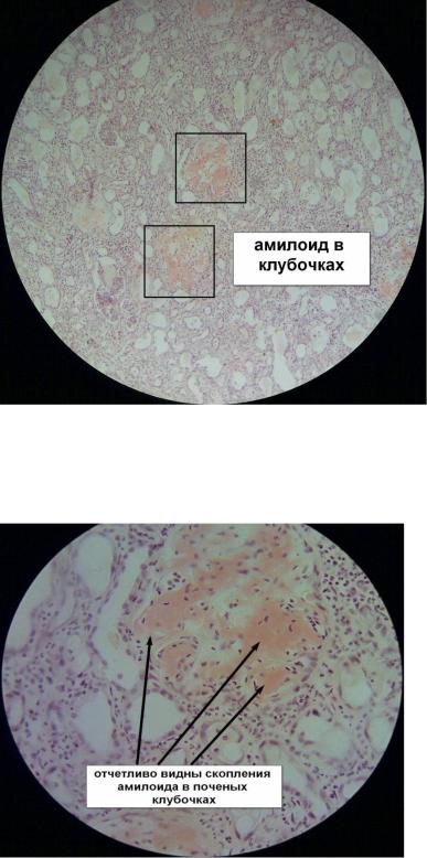 Амилоид откладывается в капиллярах и мезангии клубочков, в базальных мембранах канальцев и сосудов