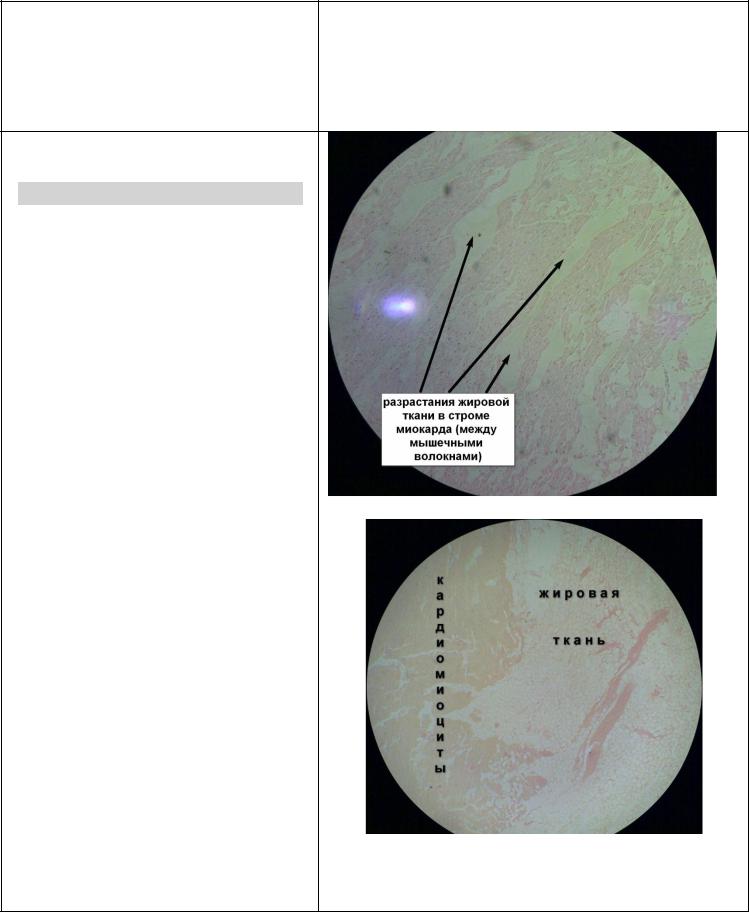 Жировая ткань разрастается под эпикардом, прорастает в строму-атрофия мыш. клеток…наиболее характерно для правого желудочка, при полном замещении на жировую ткань-разрыв сердца