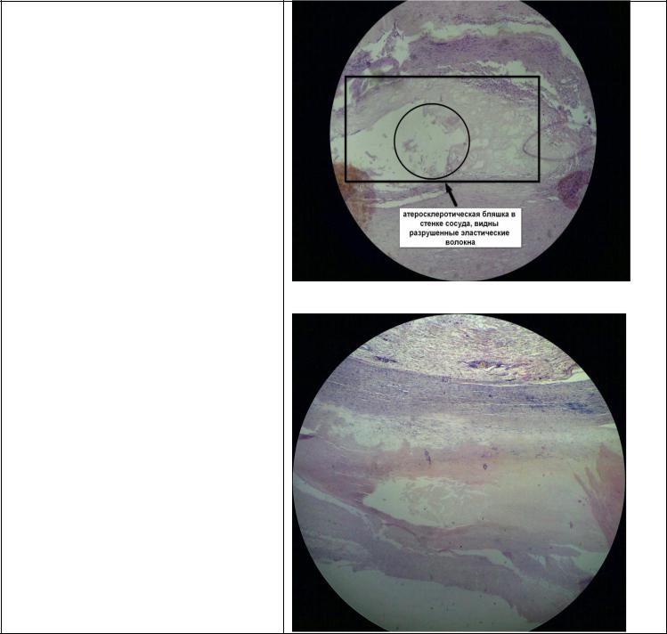 Просвет сосуда сужен. Бляшка расположенав толще стенки сосуда. Видны разрушенные эластические волокна.
