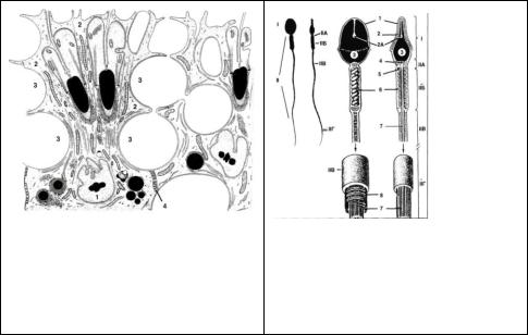 3— бухтообразные углубления на боковых поверхностях клетки Сертоли. Здесь находятся развивающиеся сперматогенные клетки, которые перемещаются вдоль поверхности клетки Сертоли, словно по конвейеру;