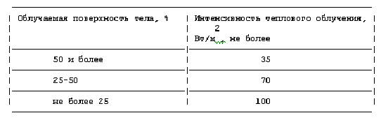 Таблица 5. Допустимые величины интенсивности теплового облучения поверхности тела работающих от производственных источников