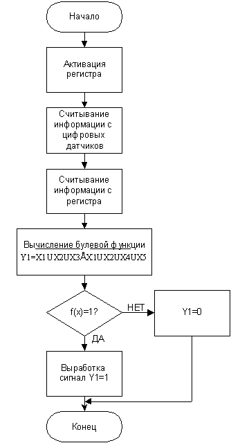 После считывания информации с цифровых датчиков, происходит вычисления булевой функции f(X1…X5). Далее система оценивает полученную в предыдущем блоке информацию f(x). Если функция не равна 1, то происходит переход к считыванию и обработке аналоговой информации. В случае равенства 1 происходит выработка сигнала Y = 1, длительностью T1=120 мкс. Затем следует конец обработки цифровой информации.