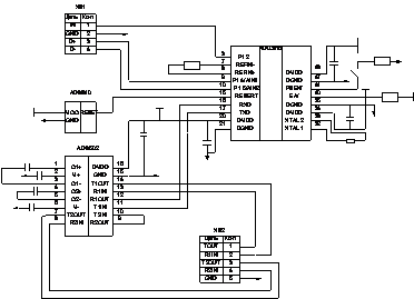 С вывода 3 микроконтроллера на неуравновешенный мост подается ток возбуждения 400мкА. Неуравновешенный мост находится за пределами печатной платы микроконтроллера (на теле человека), поэтому изображаем его как разъем XS1. Сигналы с моста поступают на положительный и отрицательный аналоговые входы основного АЦП 9 и 10. К входу 15 подключено устройство сброса ADM810, высокий уровень на этом входе в течение 24 циклов тактовой частоты при работающем осцилляторе осуществляет сброс устройства. Через контакты 16 и 17 осуществляется обмен информацией с ADM202 - устройством сопряжения с ЭВМ. ADM202 подключена к ЭВМ через порт RS-232. К контактам 32 и 33 подключен кварцевый резонатор частотой 32.768 КГц, который необходим для стабилизации частоты микроконтроллера.