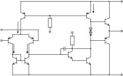 Із середини 80-х років XX ст., коли інтегральна технологія дозволила одержувати не лише n p n- але і p n p-транзистори, ОП почали будувати не за традиційною трикаскадною схемою, а за двокаскадною, яка стала основною (рис. 1.24). У такій схемі за рахунок ускладнення схемотехніки вдалося сумістити функції вхідного ДП і ПН1 (порівняно з рис. 1.23), тобто забезпечити вже у вхідному каскаді високий коефіцієнт підсилення. Крім того, використання n p n і p n p-транзисторів дозволяє обійтися без схеми зсуву рівня. Вхідний ДП на p n p-транзисторах V1 і