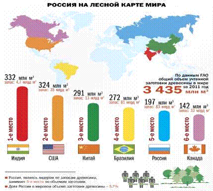 По обеспеченности лесами Россия занимает первое место в мире. В ней сосредоточено практически 25% мировых запасов древесины и более 50% ценных хвойных и листопадных лесов мира.