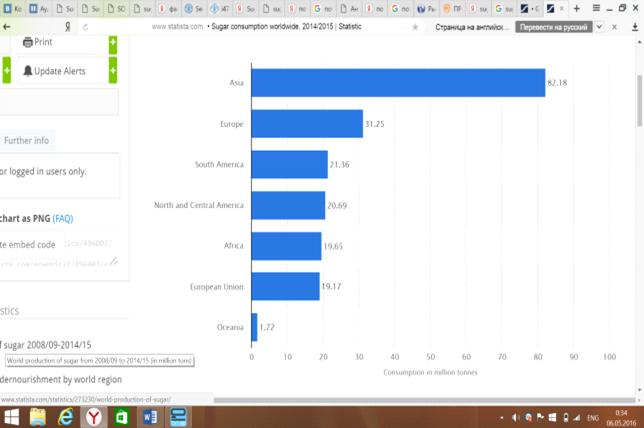 Рис. 3. Потребление сахара по регионам в (млн. тонн) в 2014/2015
