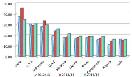 По данным статистики в 2014/2015 году крупнейшими импортерами сахара стали: Китай, Индонезия, США, ЕС, ОАЭ, Малайзия, Бангладеш, Южная Корея, Алджир, Саудовская Аравия, (см. рис. 5). В группу крупных импортеров сахара входит большое число стран. Стабильно среди них находятся: