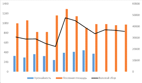 (см. рис. 7) В 2014 году урожайность земель составила 368,4 ц/га. Производство