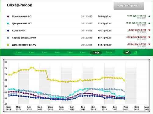 Динамика розничных цен на сахар по регионам РФ в 2015, руб/кг