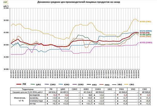 Динамика средних цен производителей сахара с 19.01.2015-15.02.16