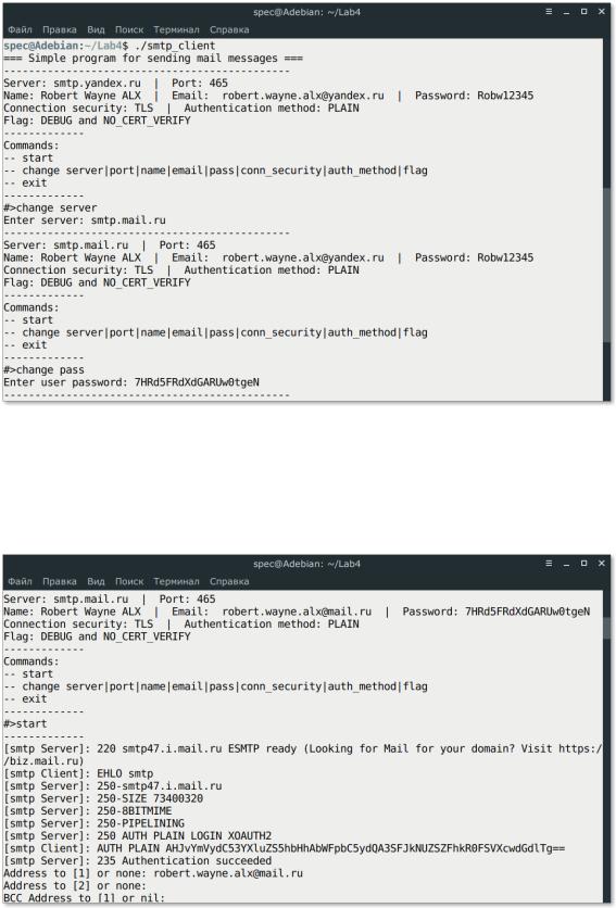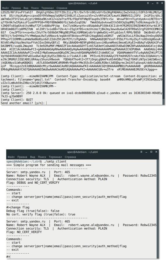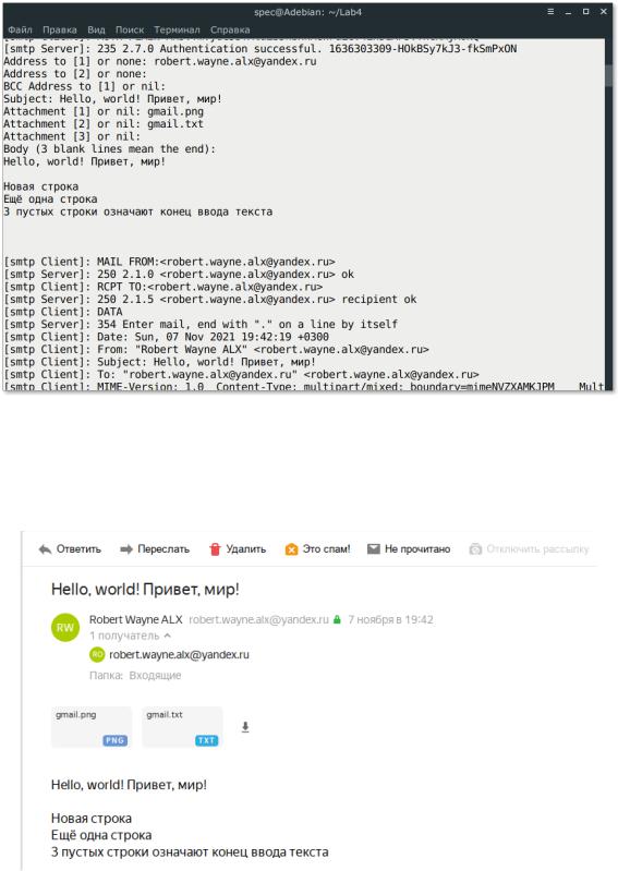 Рисунок 10. Клиент вводит email-адрес получателя (например, свой), пропускает ввод следующего адреса и BCC адресов, вводит тему письма, вводит названия файлов для прикрепления к письму, вводит тело письма, после ввода 3-х пустых строк, письмо отправляется
