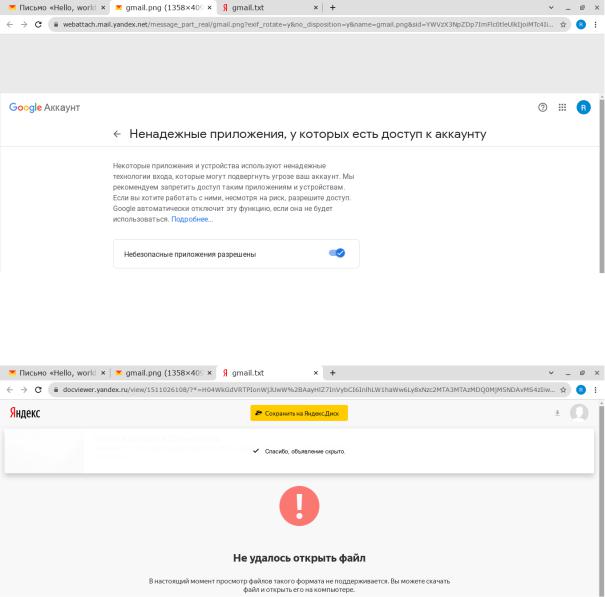 Рисунок 13. Файл «gmail.txt» в письме Yandex почты (не умеет читать txt файлы)