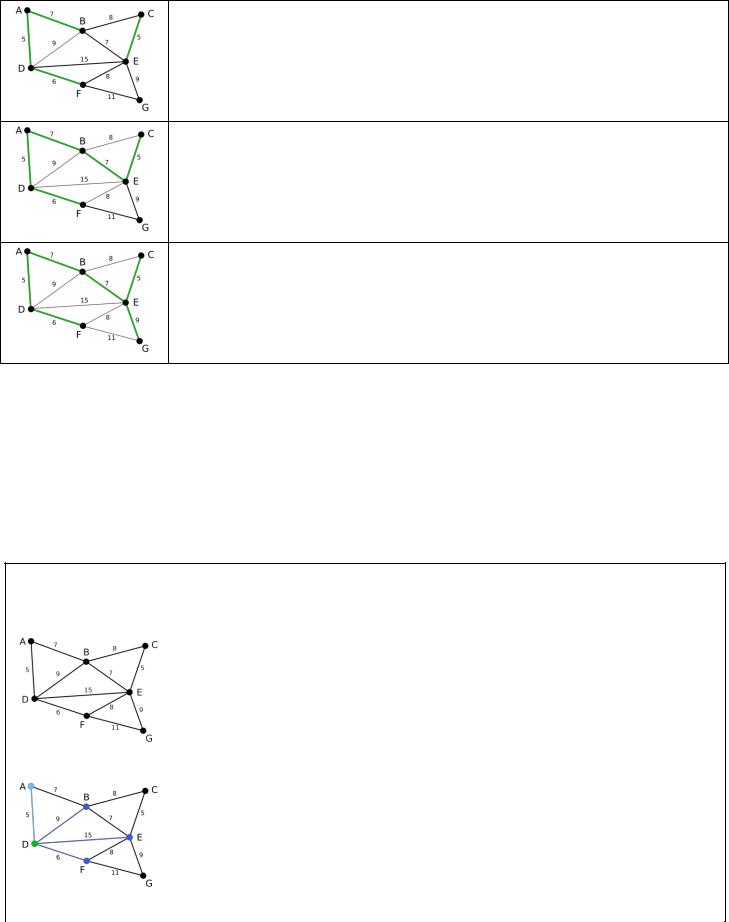 Следующие ребра — AB и BE с весом 7. Произвольно выбирается ребро AB, выделенное на рисунке. Тем самым вершина B добавляется к первому множеству выбранных вершин (A, B, D, F). Невыбранное ранее ребро BD выделено красным, так как его вершины входят в множество выбранных вершин (A, B, D, F), а, следовательно, уже существует путь (зелёный) между B и D (если бы это ребро было выбрано, то образовался бы цикл ABD).