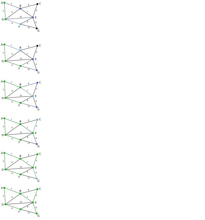 Аналогичным образом выбирается ребро BE, вес которого равен 7. Так как это ребро имеет вершины в обоих множествах выбранных вершин (A, B, D, F) и (C, E), эти множества объединяются в одно (A, B, C, D, E, F). На этом этапе красным выделено гораздо больше ребер, так как множества выбранных вершин, а, следовательно, и множества выбранных рёбер объединились. Теперь BC создаст цикл BCE, DE создаст цикл DEBA, и FE сформирует цикл FEBAD.