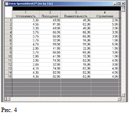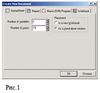 (Рис.1). С помощью счетчика выбрать нужное количество столбцов (Number of variables) и строк (Number of cases), в нашем случае соответственно 4 и 15. Нажать OK.