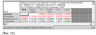 Dependent - имя показателя. В нашем случае - Выполнение ДЗ ст.. of cases - число случаев, по которым построена регрессия. В примере число равно 15.R - коэффициент множественной корреляции (эта статистика полезна в множественной регрессии, когда нужно описать зависимости между переменными).? - квадрат коэффициента множественной корреляции, обычно называемый коэффициентом детерминации. Он показывает долю общего разброса (относительно выборочного среднего зависимых переменных), которая объясняется построенной регрессией.R? - скорректированный коэффициент детерминации.