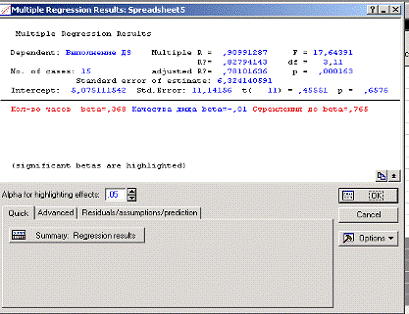 No. of cases - число случаев, по которым построена регрессия. В примере число равно 15.R - коэффициент множественной корреляции (эта статистика полезна в множественной регрессии, когда нужно описать зависимости между переменными).? - квадрат коэффициента множественной корреляции, обычно называемый коэффициентом детерминации. Он показывает долю общего разброса (относительно выборочного среднего зависимых переменных), которая объясняется построенной регрессией.R? - скорректированный коэффициент детерминации.