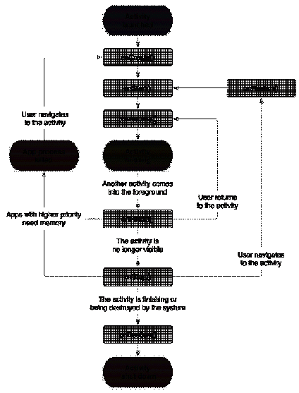 Активити представляет собой одну «страницу» с пользовательским интерфейсом (если проводить аналоги с веб-интерфейсами). Все пользовательские активити являются классами, унаследованными от стандартного класса Activity. Здесь можно провести некоторую параллель с технологией Windows Forms, однако, поскольку Java не поддерживает частичные (partial) классы, в Android-приложениях используется иной способ связывания элементов интерфейса и пользовательского класса-активити. Каждая активити обладает определённым жизненным циклом (рисунок 1.1), который является хорошей демонстрацией специфики мобильных приложений. Поскольку ресурсы мобильных устройств весьма ограничены, достоверно можно сказать лишь то, что в памяти существуют лишь те объекты, которые так или иначе относятся к отображаемому на экране содержимому. Как только активити скрывается с экрана, например, если пользователь сворачивает приложение кнопкой «Домой», активити переходит в состояние «остановлено» (stopped). Начиная с этого момента, ОС может уничтожить все объекты в оперативной памяти, относящиеся к данной активити, включая саму активити. Исходя из этого очень важно вовремя сохранять состояние приложения. Второй особенностью активити является то, что каждый раз при смене ориентации устройства с ландшафтной на портретную или наоборот, активити уничтожается и создаётся заново. Сложно сказать, чем продиктовано подобное решение, скорее всего это сделано для того, чтобы обеспечить поддержку различных вариантов пользовательского интерфейса для различной ориентации устройства. Данная особенность порождает вторую важную проблему - проблему сохранения состояния при изменении конфигурации (например, при повороте экрана). Подробнее о работе с активити можно прочитать в специализированном разделе документации [4].
