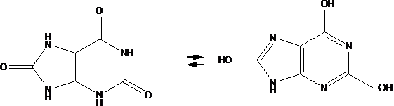 В водных растворах мочевая кислота существует в двух формах: лактамной (7,9-дигидро-1H-пурин-2,6,8(3H)-трион) и лактимной (2,6,8-тригидроксипурин) с преобладанием лактамной (рисунок 2):