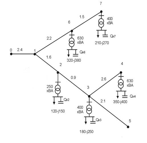 Вибрати оптимальну потужність батарей конденсаторів в розподільчій електричній мережі для забезпечення мінімальних приведених витрат. Прийняти вартість компенсації 1 кВАр на стороні нижчої напруги ТП К0=11 грн/кВАр., сумарні щорічні відрахування для батарей конденсаторів Е=0,22, вартість 1 кВт втрат приймається С0=70 грн/кВт.год. ЛЕП виконані проводом АС-35.