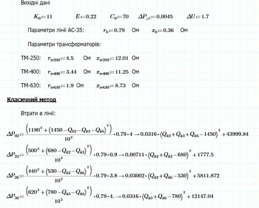 Втрати враховувати в лініях, трансформаторах та конденсаторах. Питомі втрати в конденсаторах ΔРУД = 0,0045кВт/кВАр.