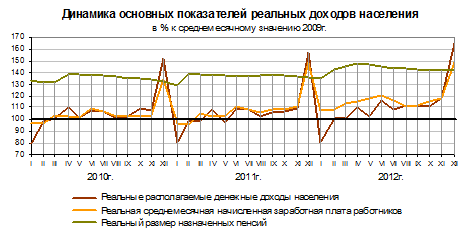 В 2012 году наблюдается рост реальной среднемесячной заработной платы работников относительно предыдущих годов.