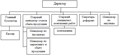 . Оптимальность - между звеньями и ступенями управления на всех уровнях управления устанавливаются рациональные связи при наименьшем числе ступеней управления. В организации существует 2 направления основной деятельности - это продажа и монтаж, соответственно существует 2 отдела, деятельностью которых руководят старшие специалисты, работу которых контролирует директор и бухгалтер. Так же на предприятие внутренняя деятельность - сервис - это делопроизводство. Благодаря организационной структуре организации одновременно непосредственно друг от друга и взаимосвязано исполняется основная деятельность, контроль и сервис.