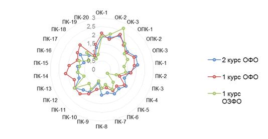 сформированности компетенций (средние показатели по группе)