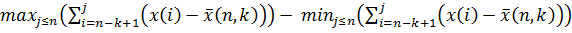 вычисляется накопленное отклонение от среднего для выборки длины k: