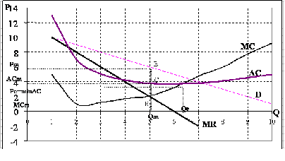 монополия не достигает производственной эффективности, поскольку для оптимального объема выпуска монополии всегда;