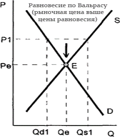 Согласно Л. Вальрасу, избыток вызывает конкуренцию между продавцами. Поэтому для того чтобы привлечь покупателей продавцы начинают снижать цену. При снижении цены объем спроса будет расти, а объем предложения сокращаться до тех пор, пока не восстановится исходное равновесие.
