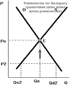 В случае отклонения цены вниз от своего равновесного значения спрос будет превышать предложение. В таком случае конкурировать за дефицитный товар начнут покупатели. Они станут предлагать продавцам более высокую цену, что позволит увеличить предложение. Так будет продолжаться до возвращения цены к равновесному уровню P0. Следовательно, по Вальрасу комбинация P0,Q0 представляет устойчивое рыночное равновесие.