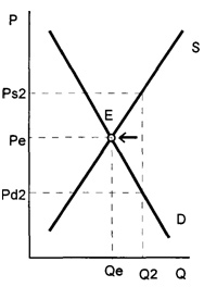 равновесие при цене P2. Объем спроса 0qs покрывается фирмами, а недостаток qsq2
