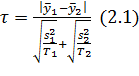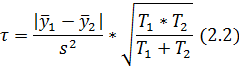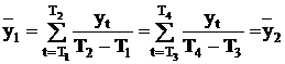 При проверке гипотезы о постоянстве математического ожидания, интервал времени (1,Т) (и соответственно временной ряд уt, t=1,2,...Т) разбивается на две части, не обязательно одинаковые по количеству содержащихся в них значений уt, с количеством наблюдений Т1 (t=1,2,..., Т1) и Т2 (t=Т1+1,..., Т), Т2=Т-Т1.