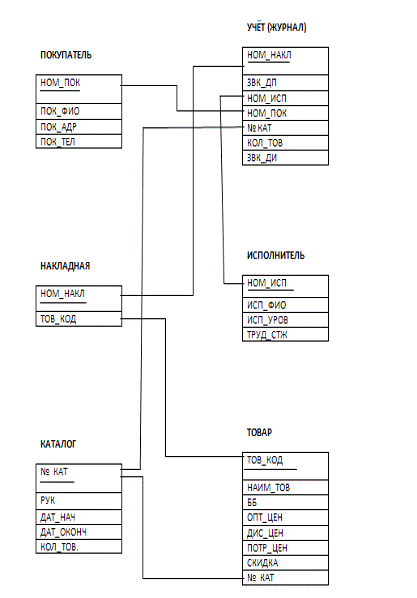 .2.2Атрибуты и колонки Атрибуты (Колонки) Сущности (Таблицы) Покупатель: №1 Атрибут: «Номер покупателя» сущности Покупатель атрибут:: Номер покупателя: Ном_пок: #pok: . Определение: Номер покупателя. . Примеры экземпляров атрибута: 9860, 2346. колонка:Type - Тип данных: DECIMAL Length - Размер: 10 Режим нулевых значений: - Not Null №2 Атрибут: «ФИО покупателя» сущности Покупатель атрибут:: ФИО покупателя: ФИО: FIO Привязка к домену: Имя домена: ФИО: . Определение: Фамилия, имя, отчество покупателя. . Примеры экземпляров атрибута: Сергеев Анатолий Юрьевич. колонка:Type - Тип данных: Char- Размер: 30 Точность:_____ Ключ: _________ №3 Атрибут: «Адрес» сущности Покупатель атрибут:: Адрес: Адр: Address Documentation: 1. Определение: Адрес покупателя. . Примеры экземпляров атрибута: г. Москва, Новая Басманная ул., д.999, кв.666. колонка:Type - Тип данных: Char- Размер: 50 Точность: _____ Ключ: _____________ №4 Атрибут: «Телефон» сущности Покупатель атрибут:: Телефон: Тел: Tel Documentation: 1. Определение: контактный номер телефона покупателя. . Примеры экземпляров атрибута: 356-67-47. колонка:Type - Тип данных: Char- Размер: 16 Точность:_____ Ключ: _____________ Атрибуты (Колонки) Сущности(Таблицы) Учёт: №1 Атрибут: «Номер_накладной» сущности Учёт: Номер накладной Label: Ном_накл: #nakl: 1. Определение: Номер накладной. . Примеры экземпляров атрибута: 9834510. колонка:Type - Тип данных: DECIMAL- Размер: 10 Точность:_____ Ключ: PK-Primary Key №2 Атрибут: «Дата подачи заявки» сущности Учёт - атрибут:: Дата подачи заявки: звк_ДП: zvk_DP Привязка к домену: Имя домена: Дата: 1.Определение: Дата подачи заявки покупателем. 2.Примеры экземпляров: 13/05/2011.Type - Тип данных: Date- Размер:____ Точность:_____ Ключ: ________ №3 Атрибут: «Дата исполнения заявки» сущности Учёт - атрибут:: Дата исполнения заявки: звк_ДИ: zvk_DI Привязка к домену: Имя домена: Дата: 1.Определение: Дата исполнения заявки исполнителем. 2.Примеры экземпляров: 23/06/2011. - колонка:Type - Тип данных: Date- Размер:____ Точность:_____ Ключ: ________ №4 Атрибут: «Количество товаров» сущности Учёт - атрибут:: Количество товаров: Кол_тов: Kol_tov: 1.Определение: Количество товаров в заявке. 2.Примеры экземпляров: 3. - колонка:Type - Тип данных: INTEGER- Размер:____ Точность:_____ Ключ: ________ №5 Атрибут: «Номер покупателя» сущности Учёт Наследуется от атрибута сущности Покупатель по неидентифицирующей связи - колонка:Type - Тип данных: DECIMAL - Размер: 10 Точность:_____ Ключ: FK - Foreign Key №6 Атрибут: «Номер исполнителя» сущности Учёт Наследуется от атрибута сущности Исполнитель по неидентифицирующей связи - колонка:Type - Тип данных: DECIMAL - Размер: 10 Точность:_____ Ключ: FK - Foreign Key №7 Атрибут: «Номер каталога» сущности Учёт Наследуется от атрибута сущности Каталог по неидентифицирующей связи - колонка:Type - Тип данных: CHAR - Размер: 10 Точность:_____ Ключ: FK - Foreign Key Атрибуты (Колонки) Сущности(Таблицы) Накладная: №1 Атрибут: «Номер накладной» сущности Накладная - атрибут:: Номер накладной: Ном_накл: #nakl: 1.Определение: Номер накладной. 2.Примеры экземпляров: 334001. - колонка:Type - Тип данных: DECIMAL- Размер: 10 Точность:_____ Ключ: PK-Primary Key Наследуется от атрибута сущности Товар по неидентифицирующей связи - колонка:Type - Тип данных: DECIMAL - Размер: 10 Точность:_____ Ключ: FK - Foreign Key Атрибуты (Колонки) Сущности(Таблицы) Исполнитель: №1 Атрибут: «Номер_исполнителя» сущности Исполнитель - атрибут:: Номер исполнителя: Ном_исп: #isp : 1.Определение: Номер исполнителя. 2.Примеры экземпляров: 342401. - колонка:Type - Тип данных: DECIMAL- Размер: 10 Точность:_____ Ключ: PK-Primary Key №2_Атри
