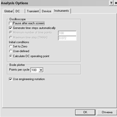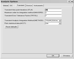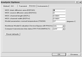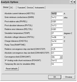 Gmin - минимальная проводимость ветви цепи (проводимость ветви, меньшая GMIN, считается равной нулю); Pivrel, Pivtol - относительная и абсолютная величины элемента строки матрицы узловых проводимостей (например, при расчете по методу узловых потенциалов), необходимые для его выделения в качестве ведущего элемента;